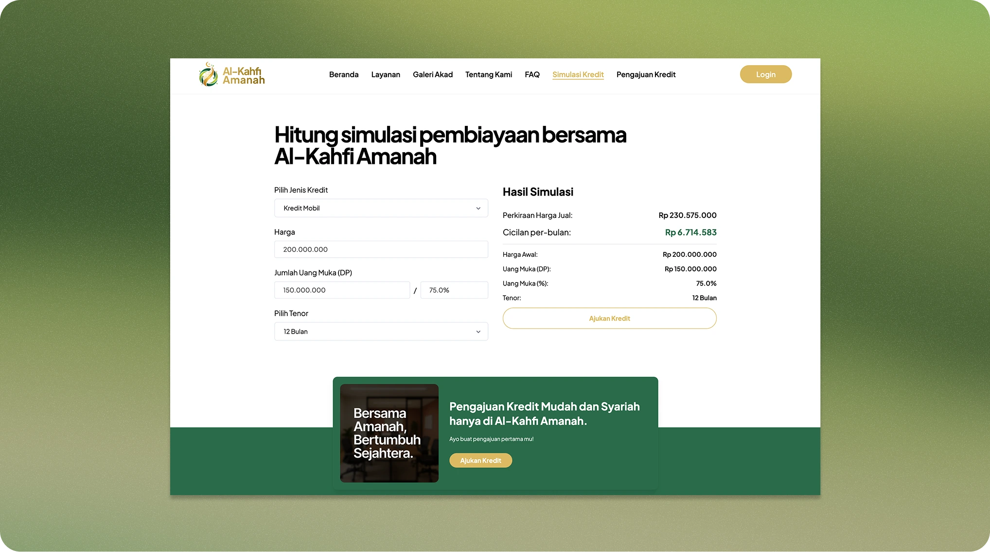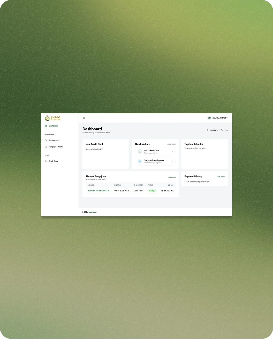 The result is a streamlined sharia-compliant financing platform that balances religious compliance with modern usability. Al-Kahfi Amanah delivers transparent financing flows, clear transaction structures, and an intuitive digital experience that builds trust and confidence among users. The system successfully enables Muslim communities to access halal financing for essential goods in a way that is ethical, accessible, and operationally reliable.