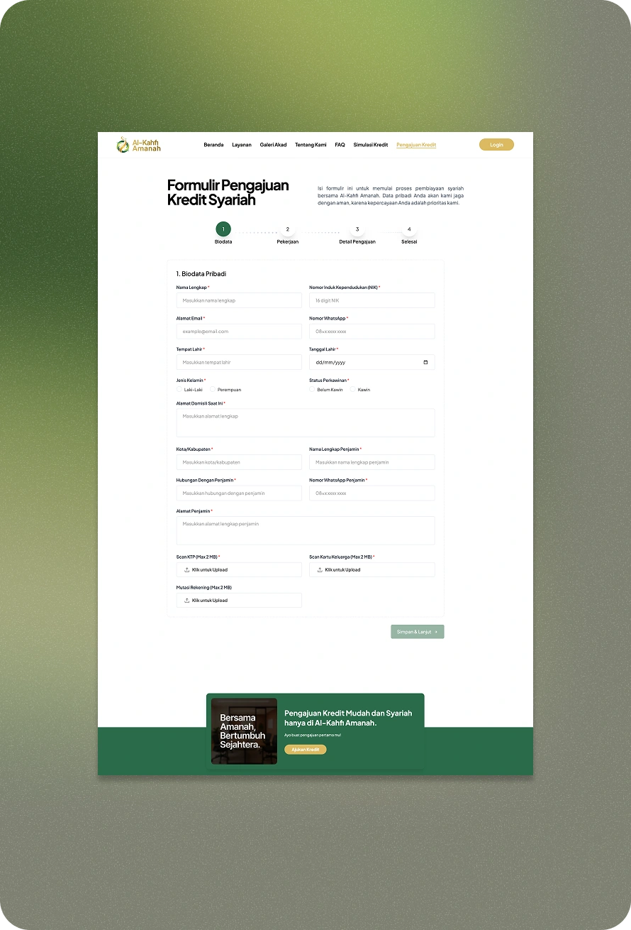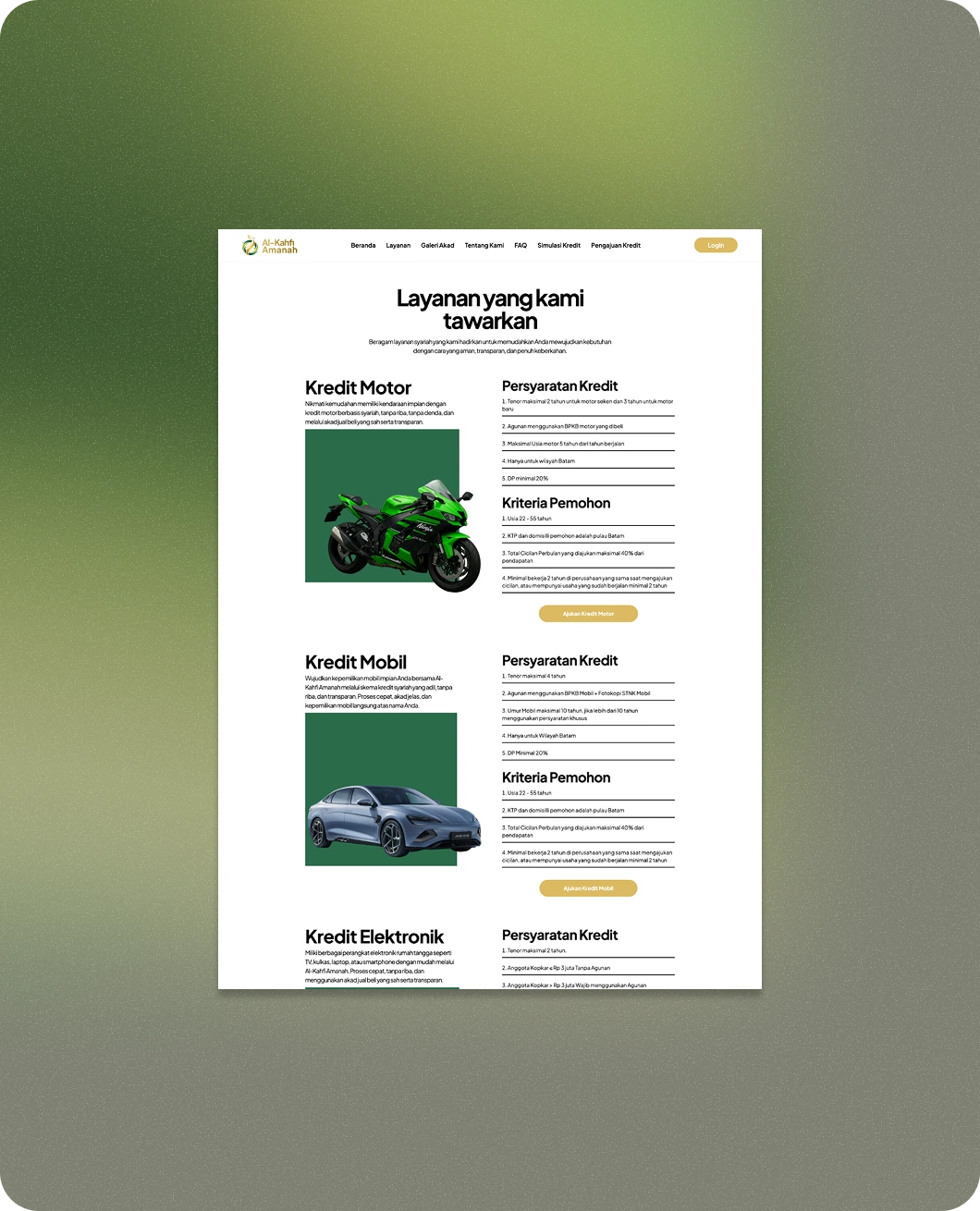 Alkahfi Amanah Credit is a Sharia-compliant financing platform that provides Muslim communities with ethical and transparent halal financing to acquire essential goods. It is designed to be accessible, trustworthy, and fully aligned with Islamic principles, ensuring every transaction is fair and responsible.
